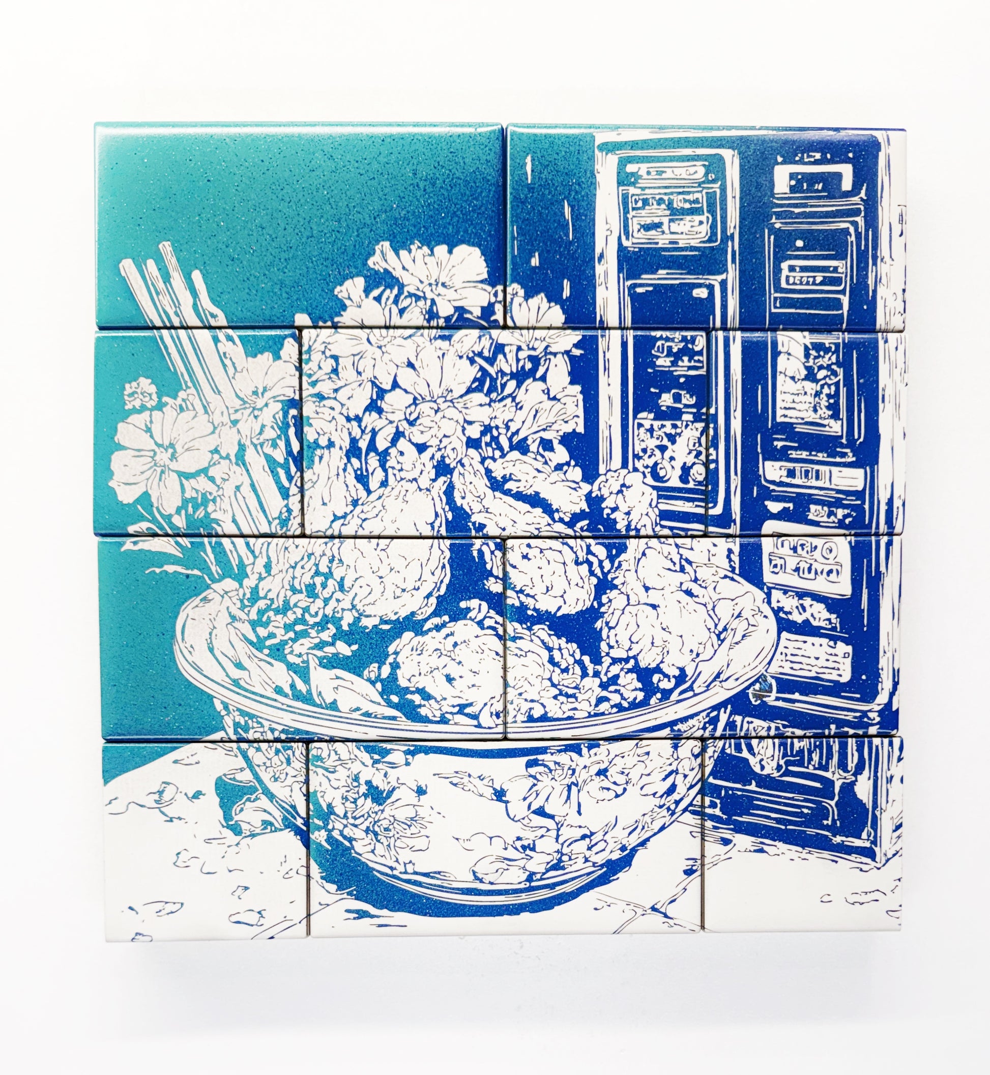 12x12 Painted and Pearlescent engraved tile on wood panel.